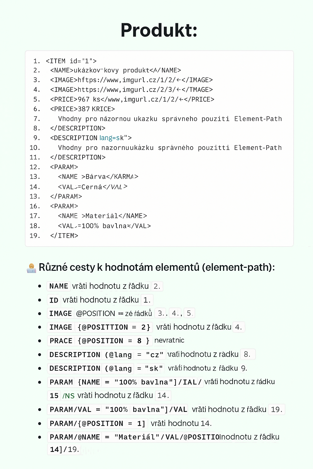 Zjednodušeně je element-path cesta nebo adresa, pomocí které se dostanete k požadované hodnotě jednotlivého elementu (a to i zanořeného) jakéhokoli produktu.