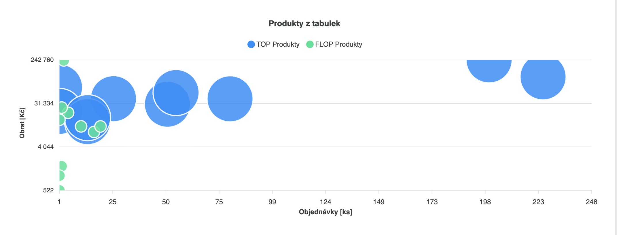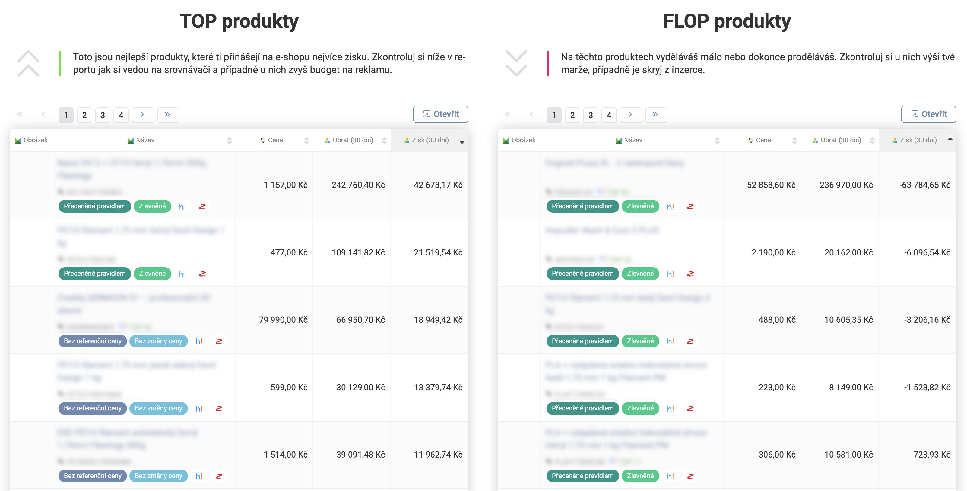 Představte si, že prodáváte doplňky pro 3D tisk. V TOP produktech se vám pravidelně objevují filamenty určité značky, které tvoří většinu zisku, zatímco jiné modely zůstávají mezi FLOPy.