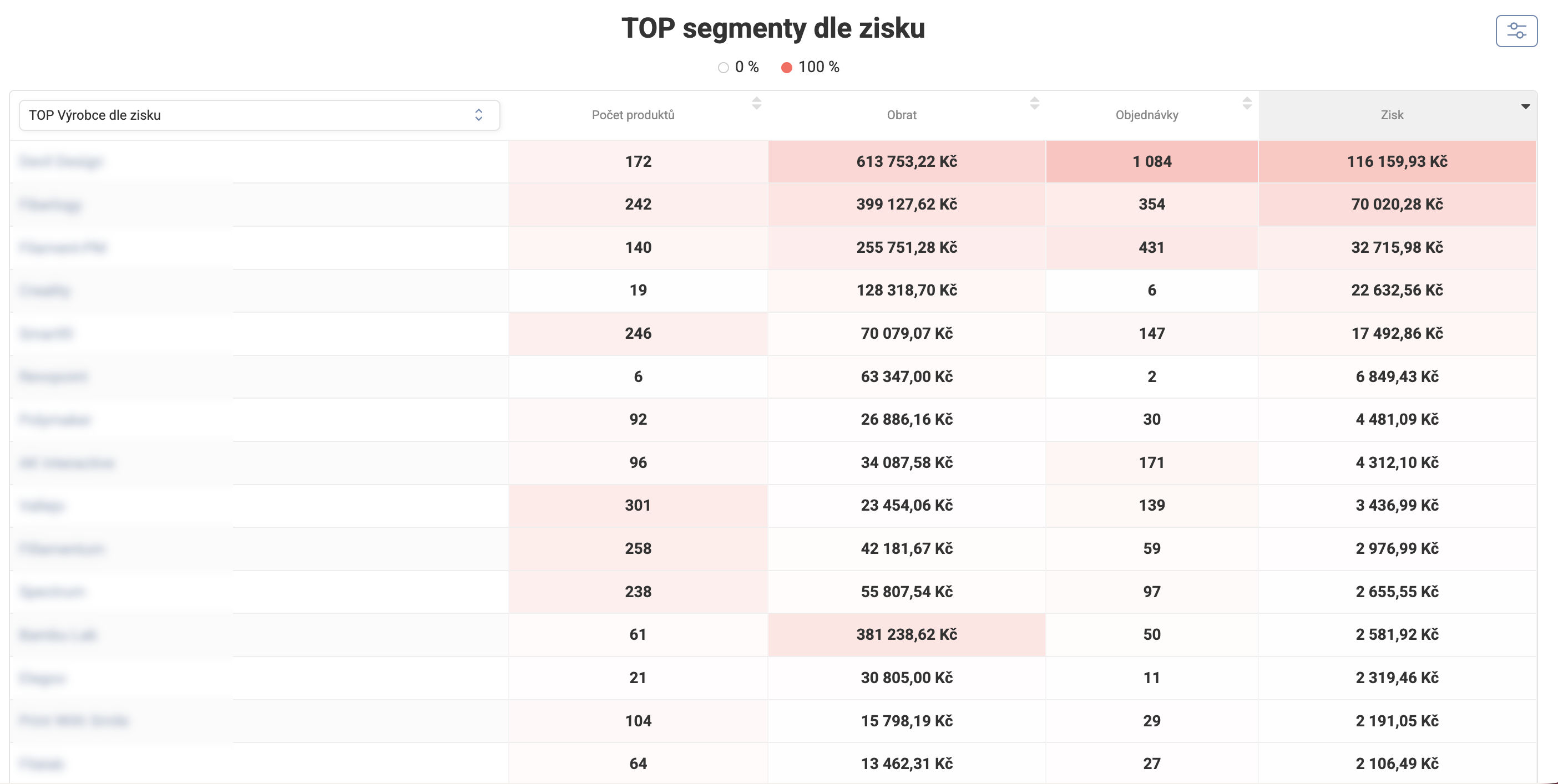 - TOP segmenty podle zisku – přehled značek a kategorií, které jsou ziskově nejúspěšnější.