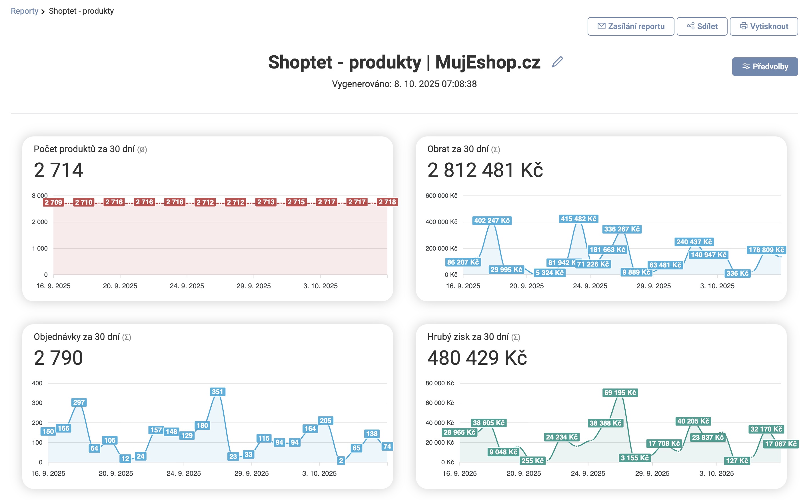 - Souhrnné statistiky za 30 dní – počet produktů, obrat, objednávky a hrubý zisk.